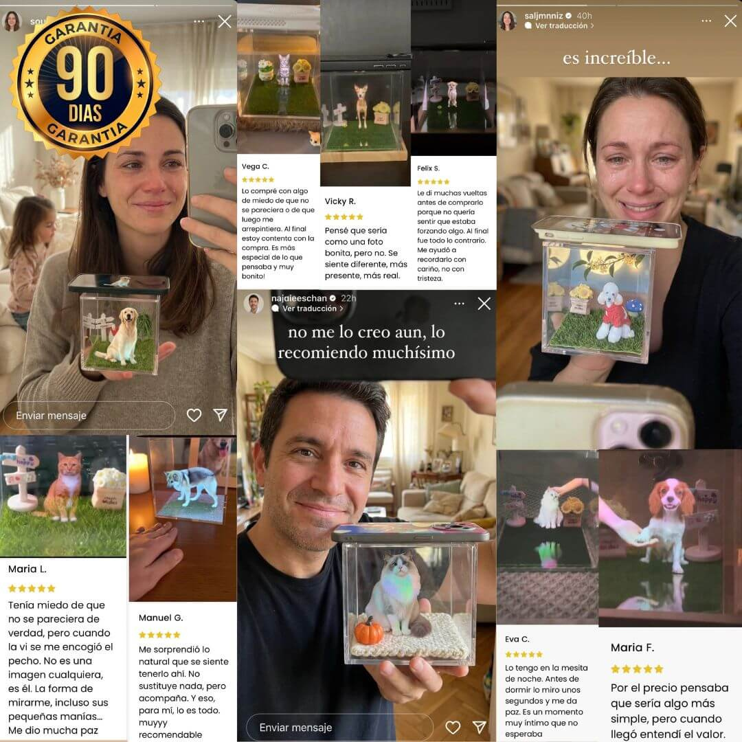 Coloca tu teléfono encima de la caja, activa el holograma y observa cómo tu mascota vuelve a moverse delante de ti. Luz, movimiento y presencia real.